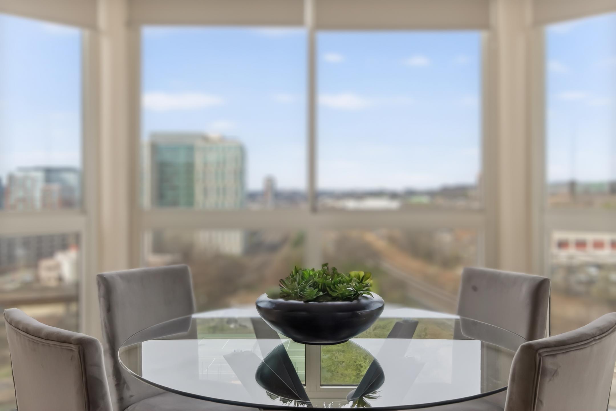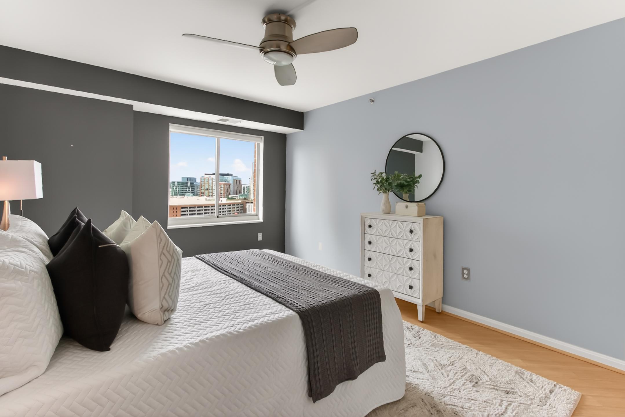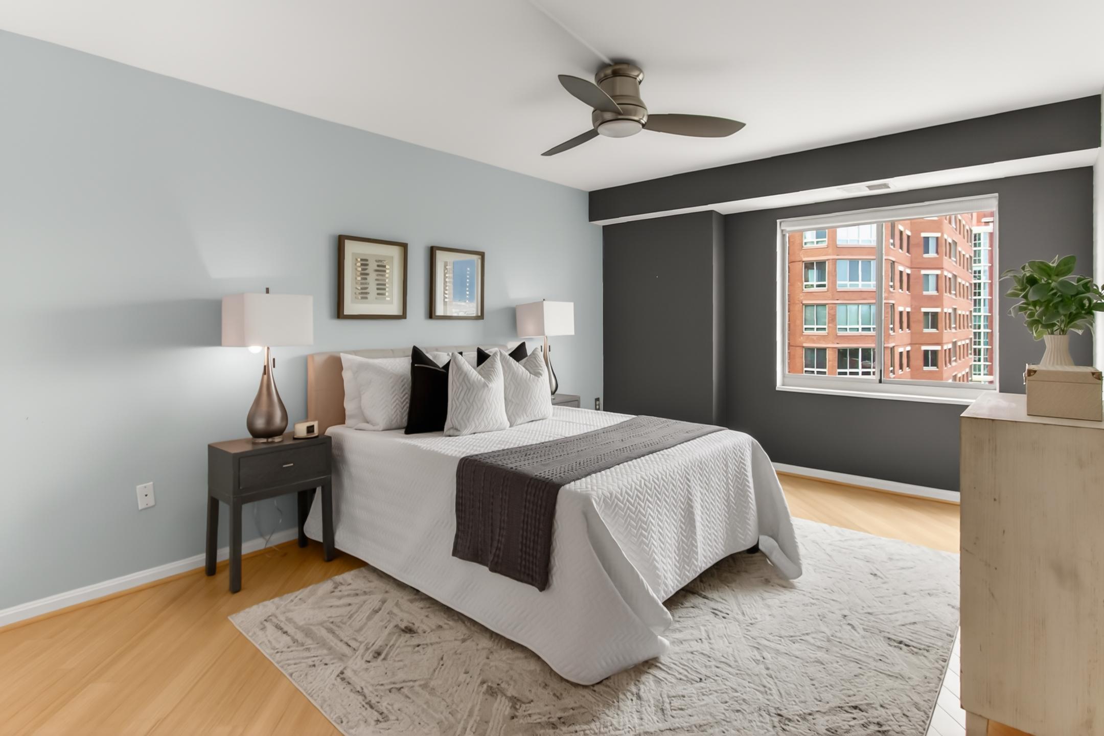 Completely renovated 3-bedroom, 2.5-bath corner residence with over 1,700 finished square feet of living space, filled with natural light and showcasing sweeping views of the George Washington Masonic National Memorial from nearly every room. This thoughtfully redesigned home features bamboo hardwood flooring, fresh 2024 interior paint, George Kovacs lighting, Murano glass accents, electric blinds, and expansive windows throughout. The open living and dining areas flow into a stunning glass-enclosed sunroom ideal for a home office, den, or informal dining. The reconfigured eat-in kitchen offers quartz waterfall countertops, added pantry storage, flat-top induction cooktop, Advantium microwave/convection oven, stainless steel appliances, and a fantastic view. A chic updated powder room rounds out the main living area. The spacious primary suite boasts a contemporary lighted ceiling fan, four closets with custom Elfa organizers including a walk-in closet and an updated 2024 ensuite bath with a dual sink vanity with Keystone counters, sleek lighted mirrors and fixtures, a vessel soaking tub, and frameless glass shower. Two additional bedrooms, one with a built-in deck and bookcases, one with a Murphy bed that conveys, share access to the renovated hall bath. An in-unit washer and dryer and generous storage space add convenience and complete the interior. The unit includes two deeded and assigned side-by-side garage parking spaces (#2-21 and #2-22) in a prime location and a deeded storage unit on the 4th floor. Located in the prestigious Carlyle Towers, residents enjoy two outdoor pools, an indoor infinity lap pool, hot tub, saunas, two fitness centers, clubhouse and party room, sports courts, shuffleboard, a putting green, 24-hour front desk and security, and a free weekday rush-hour shuttle to King Street Metro. The community is non-smoking and permits one pet per unit with no size or breed restrictions. Ideally situated just blocks from King Street Metro and Old Town Alexandria’s waterfront, this prime location offers easy access to boutiques, restaurants, cafes, the free trolley, Routes 1, 7, and 236, I-95, I-495, GW Parkway, Amazon HQ2, Del Ray, Shirlington, Pentagon City, Springfield, Jones Point Park, Mount Vernon Trail, and the Carlyle Dog Run Park.